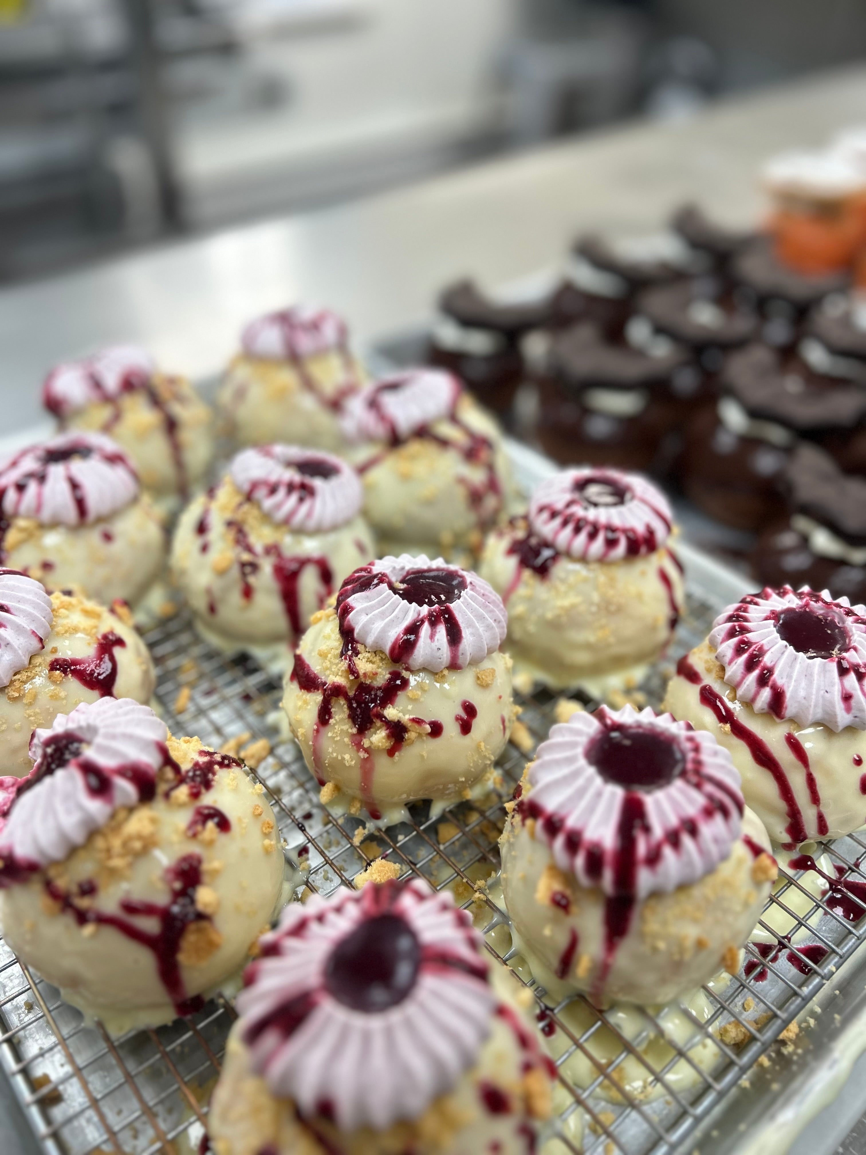 Sourdough donut filled with roasted white chocolate and tonka-poached pear.